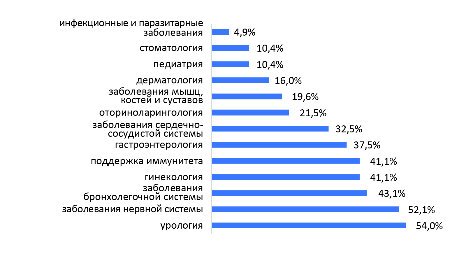 По мнению большинства аптечных специалистов, фитопрепараты имеют реальную клиническую ценность при лечении урологических (54%) и неврологических (52,1%) заболеваний (рисунок 2). Значительная доля респондентов считает также, что они эффективны при лечении респираторных (43,1%), гинекологических (41,1%), гастроэнтерологических (37,5%) заболеваний, а также в целях поддержки иммунитета (41,1%).