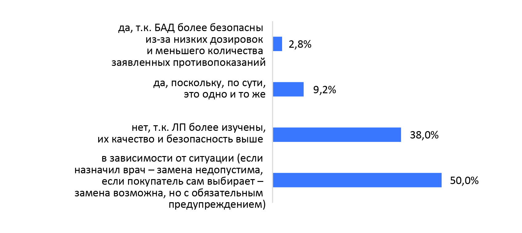 38,0% опрошенных считают, что замена ЛРП на рБАД аналогичного состава недопустима, поскольку ЛРП априори являются более изученными продуктами и к ним предъявляются более строгие требования при регистрации (рисунок 3). О возможности замены заявили 12,0% респондентов. В то же время 50,0% отмечает, что решение должно зависеть от конкретной ситуации (например, если это рекомендация врача, замена недопустима, а если покупатель сам выбирает, то замена возможна, но с обязательным предупреждением покупателя о регуляторном статусе приобретаемого товара). Мнения о возможности замены в значительной степени согласуются с ответами по предыдущему вопросу, но готовность специалистов к замене ЛРП на рБАД все же выше, чем оценки взаимозаменяемости этих продуктов.