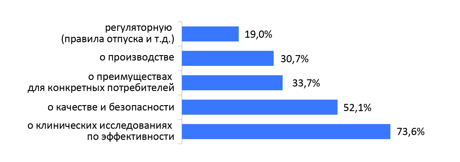 В большинстве случаев специалисты хотели бы получать больше достоверной информации о клинических исследованиях по эффективности (73,6%), а также о качестве и безопасности продуктов (52,1%). Треть респондентов нуждается в информации о преимуществах использования фитопрепаратов у конкретных потребителей (детей, беременных, пожилых людей, людей с хроническими заболеваниями) (рисунок 4).