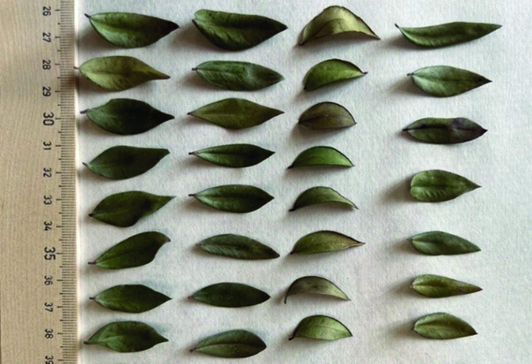 Предварительный морфологический анализ растительного сырья показал сходство листьев мирта обыкновенного разных мест произрастания и невысокую вариабельность внутри каждого образца с учетом их размеров и формы. В частности, вариабельность размеров листьев мирта образца из Никитского ботанического сада по длине от 1,5 до 3,4 см, по ширине от 1,4 до 1,9 см с, как правило, ланцетной формой листовой пластинки (рисунок 2).