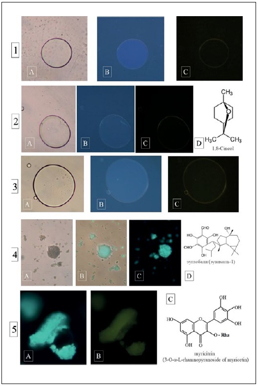 Figure 3. Comparative study of objects luminescence: 1 – myrtle essential oil (A – visible light, B – irradiation at λ= 360 nm, C – irradiation at λ=420 nm); 2 – 1,8-cineol (A – visible light, B – irradiation at λ= 360 nm, C – irradiation at λ=420 nm, D – structural formula of 1,8-cineol); 3 – eucalyptus essential oil (A – visible light, B – irradiation at λ= 360 nm, C – irradiation at λ=420 nm); 4 – euglobalis (euvimal-1) suspension (A – visible light, B – irradiation at λ= 360 nm on white background, C – irradiation at λ=360 nm on dark background, D – structural formula of euvimal-1); 5 – myricitrin suspension (А – irradiation at λ= 360 nm, B – irradiation at λ=420 nm, C – structural formula of myricitrin).