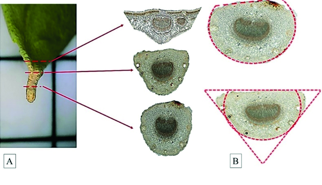 Figure 4. Cross sections (x 100): A – cross-section topography; B – shape of the petiole sections.
