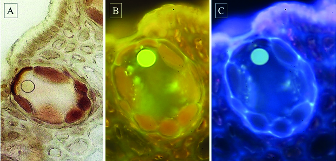 Figure 5. Essential oil receptacles (x 100): A – visible light; B – irradiation with λ= 420 nm, C – irradiation with λ=360 nm.