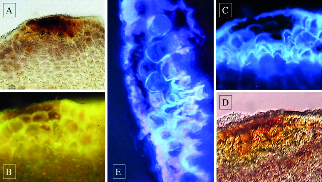 Рисунок 6. Чечевички (х 400): А – видимый свет, B – облучение при λ= 420 нм, C – облучение при λ=360 нм; D – окраска анилином сернокислым 10%; E – облучение при λ=360 нм после окрашивания анилином сернокислым.