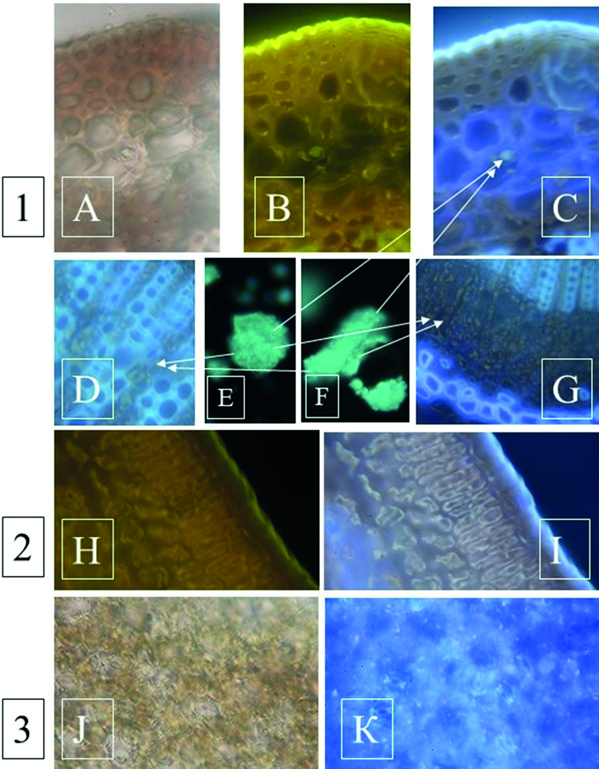 Рисунок 7. Люминесценция биологически активных соединений и тканей листьев мирта обыкновенного (х 400): 1 – поперечное сечение черешка (А – видимый свет, B – облучение при λ= 420 нм, C – облучение при λ=360 нм); D – ксилема, облучение при λ=360 нм; E – эуглобали (эувималь-1) суспензия, облучение при λ=360 нм на темном фоне; F – мирицитрин суспензия, облучение при λ= 360 нм; G – флоэма, облучение при λ=360 нм; 2 – поперечное сечение листа (H – облучение при λ= 420 нм; I – облучение при λ=360 нм); 3 – поверхность эпидермиса (J – видимый свет; K – облучение при λ=360 нм).