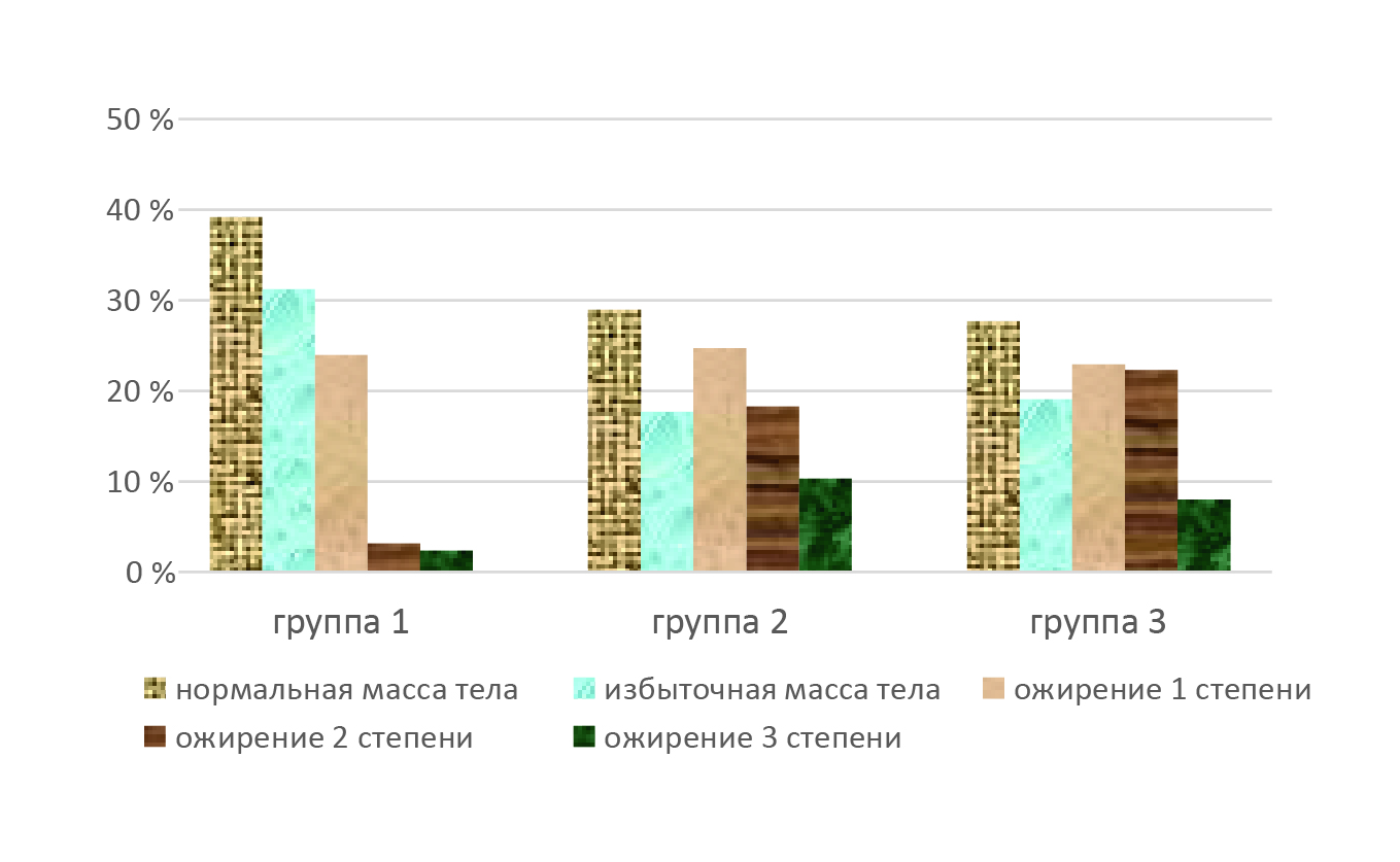 Для выявления избыточной массы тела или ожирения проводился расчет индекса массы тела (ИМТ) по формуле Кетле (масса тела (кг) / (рост (м))2. При ИМТ 25,0–29,9 кг/м² выявлялась избыточная масса тела, при значениях в пределах от 30,0 до 34,9 кг/м² диагностировалось ожирение 1 степени, при результатах равных 35,0–39,9 кг/м²– ожирение 2 степени, значения от 40,0 кг/м² и выше соответствовали ожирению 3 степени.