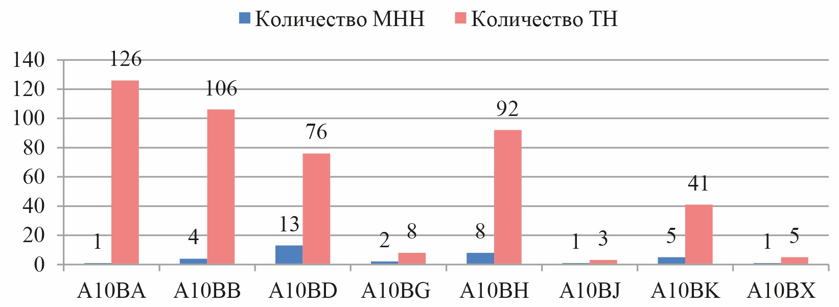 Российский рынок ПГП анализировали при помощи Государственного реестра лекарственных средств по количеству МНН и ТН9. Анализируемая группа ЛП представлена 8 АТХ подгруппами, при этом на все МНН из групп A10BF и A10BC полностью отсутствовала регистрация препаратов в России. Количество существующих на федеральном рынке ТН с учетом дозировок оценивалось также путем анализа Государственного реестра лекарственных средств. На российском рынке зарегистрировано 35 МНН и 457 ТН. Количество МНН и ТН в каждой подгруппе на фармацевтическом рынке РФ представлено на рисунке 1.