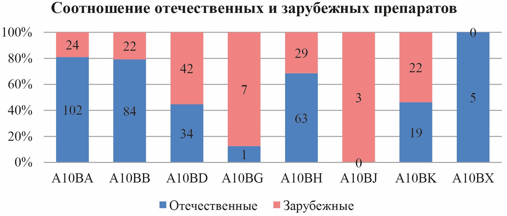 В структуре товарного ассортимента преобладали отечественные препараты подгрупп бигуанидов, производных сульфонилмочевины, ингибиторов ДПП 4 и прочих препаратов (A10BX). Однако в ряде подгрупп преобладали препараты зарубежного производства (комбинированные препараты, тиазолидиндионы, аналоги глюкагоноподобного пептида-1, ингибиторы натрий-глюкозного котранспортера 2 типа). Общедолевое соотношение отечественного / импортного производства составило 67,40% и 32,60% соответственно.