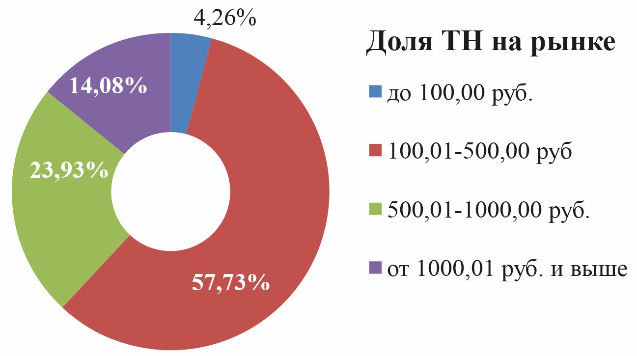 4. Большинство препаратов в аптеках республики по своей стоимости относятся к категории 100,01–500,00 руб. (57,73%).
