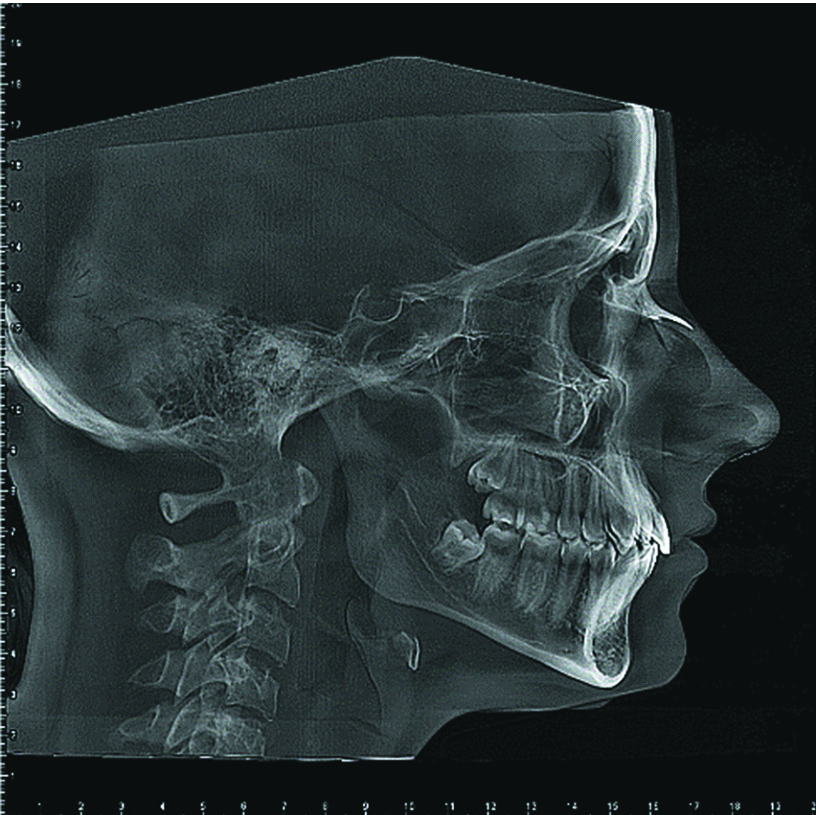 Было обследовано 25 пациентов (возраст от 12 до 40 лет) с дистальной окклюзией. Обследование проводилось согласно протоколу, который включен в «Историю болезни ортодонтического больного», разработанную на кафедре ортодонтии ФГБОУ ВО «Российский университет медицины» и утвержденную приказом Минздрава России №834. После осмотра участники исследования прошли телерентгенографию (ТРГ) головы в боковой проекции (рисунок 1).
