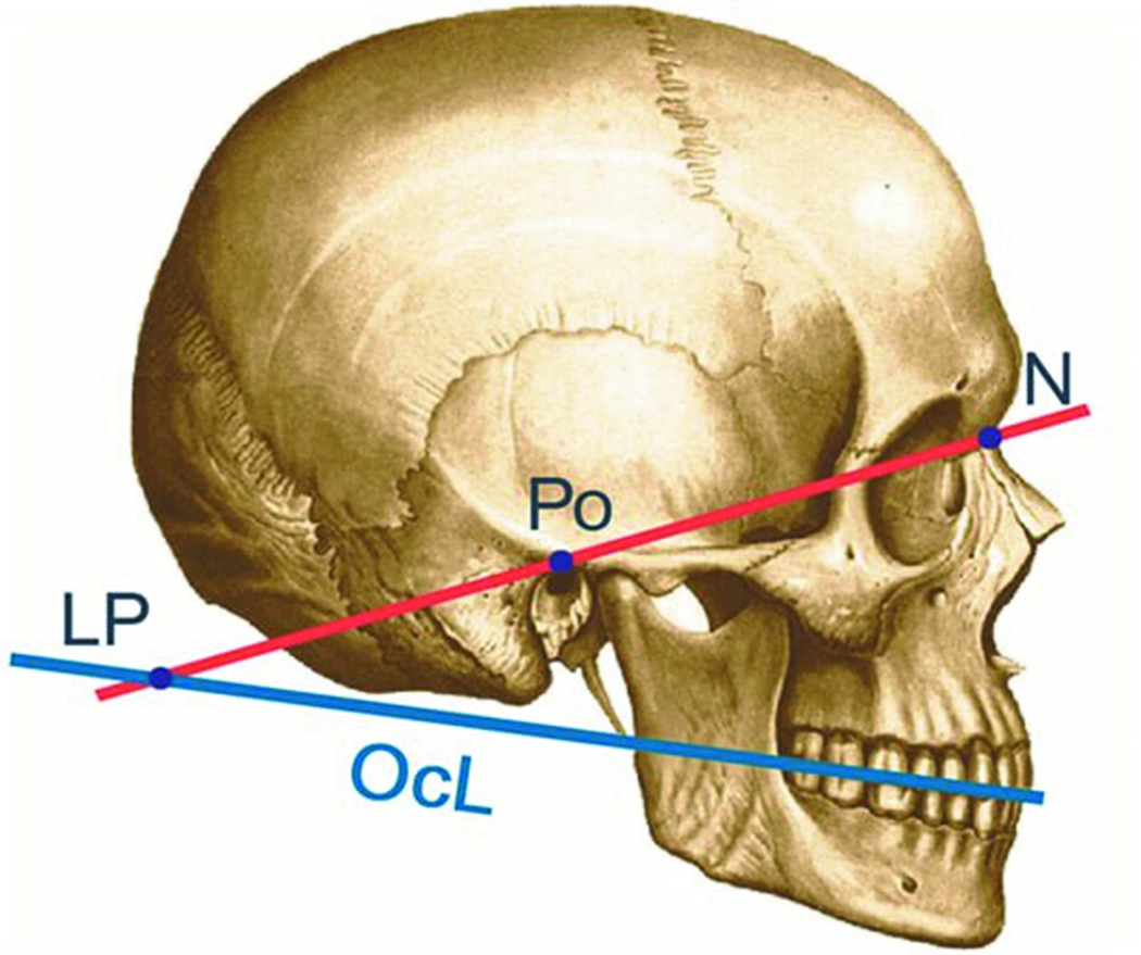 Нами был предложен новый подход для оценки положения зубов, зубных рядов, окклюзии относительно координатного параметра LP. Этот параметр определяется при пересечении линии N–Po, проходящей через точку N, расположенную на передне-верхнем крае носолобного шва, и точку Po, расположенную на вершине наружного слухового прохода, и окклюзионной линии, проходящей через срединную контактную точку на режущих краях центральных резцов и точку в области дистально-щечных бугров первых моляров (рисунок 4).