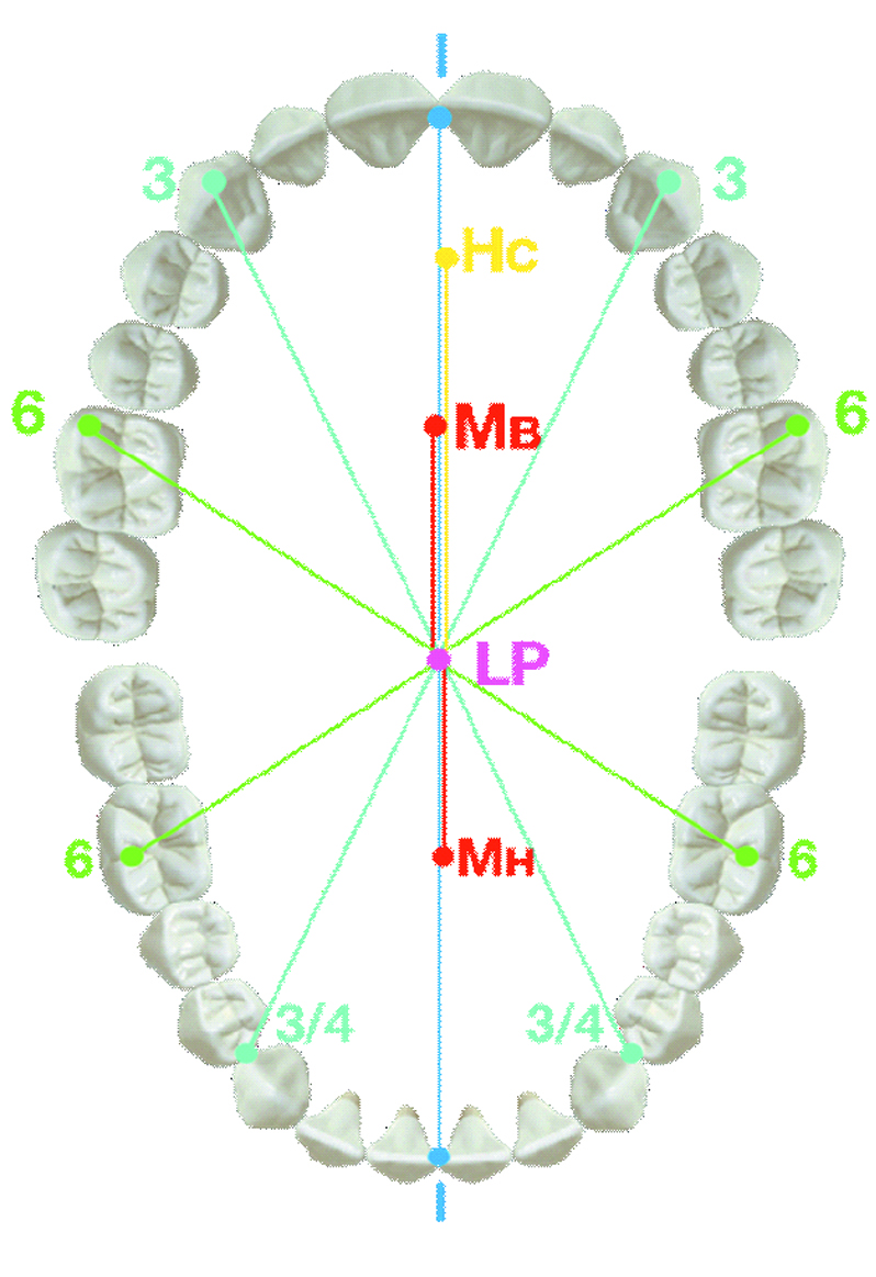 Относительно точки LP проводится оценка положения первых моляров, клыков, резцов как верхнего, так и нижнего зубного ряда (рисунок 5).