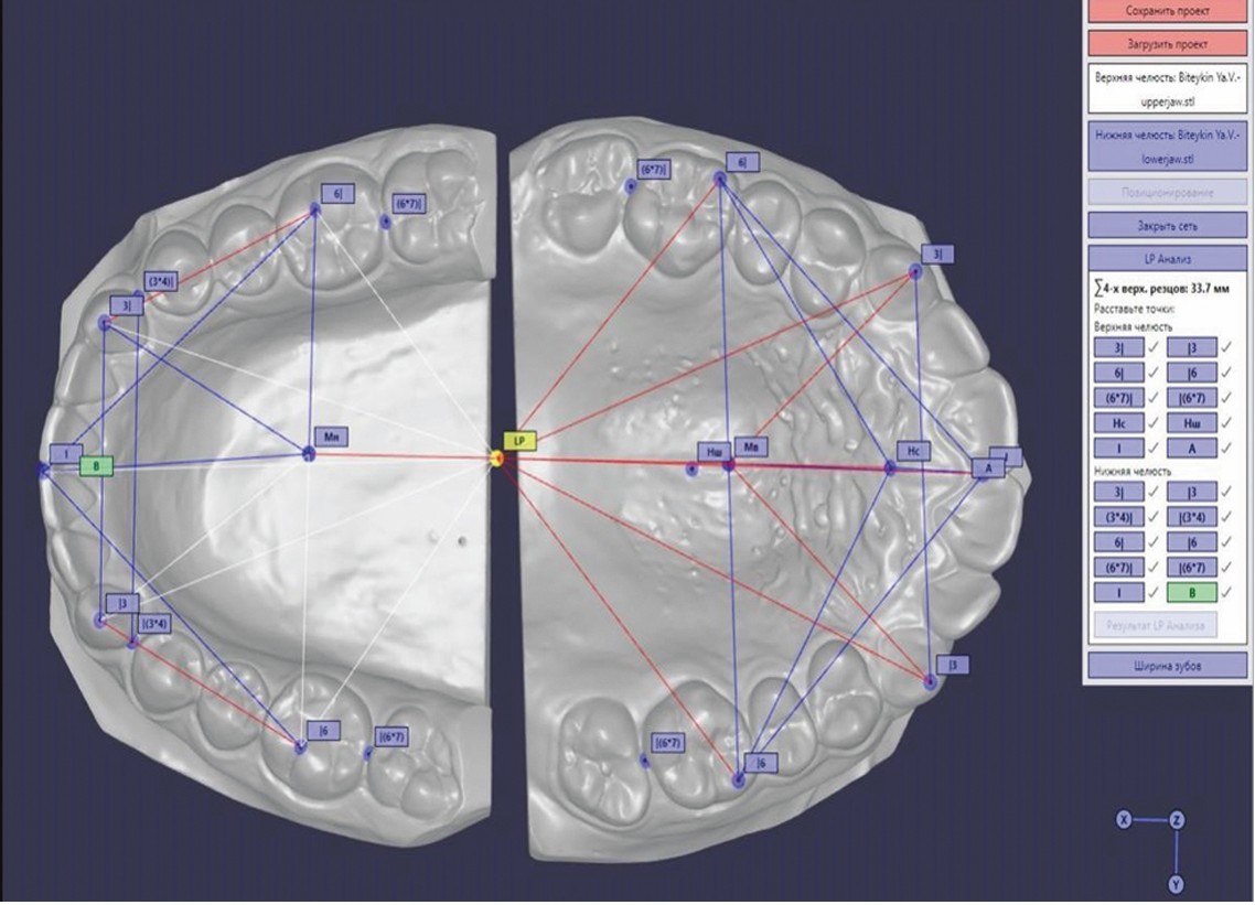 Перед проведением данного анализа также измерялась сумма мезиодистальных размеров четырех резцов верхней челюсти. Такой метод оценки обеспечивает более глубокий анализ положения зубов, зубных рядов, а также их отклонений от нормальных значений, что в свою очередь повышает точность диагностики и улучшает планирование ортодонтического лечения.