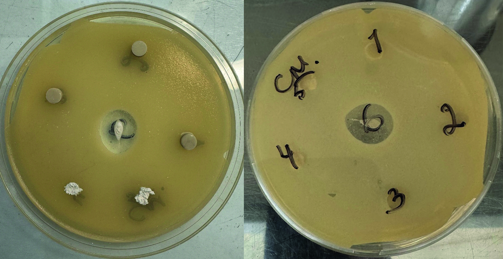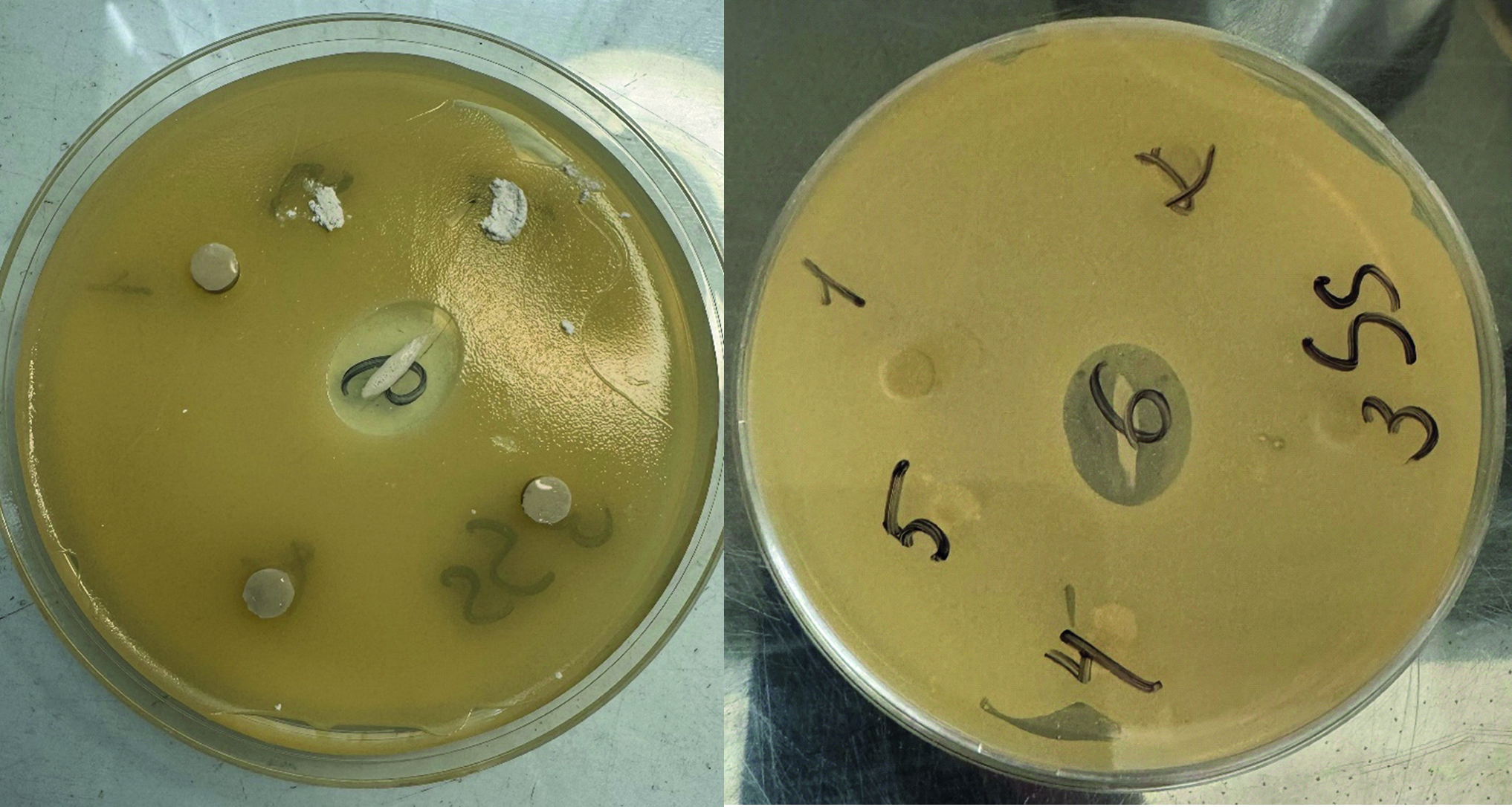 Results. The exposure time of the seals was 24 hours at 37 °C in the thermostat. As a result, samples 1-5 showed no areas of delayed microbial growth. Sample 6 showed a growth retardation zone: 19 mm on a cup with S. aureus and 15 mm on a cup with mixed microbiota.