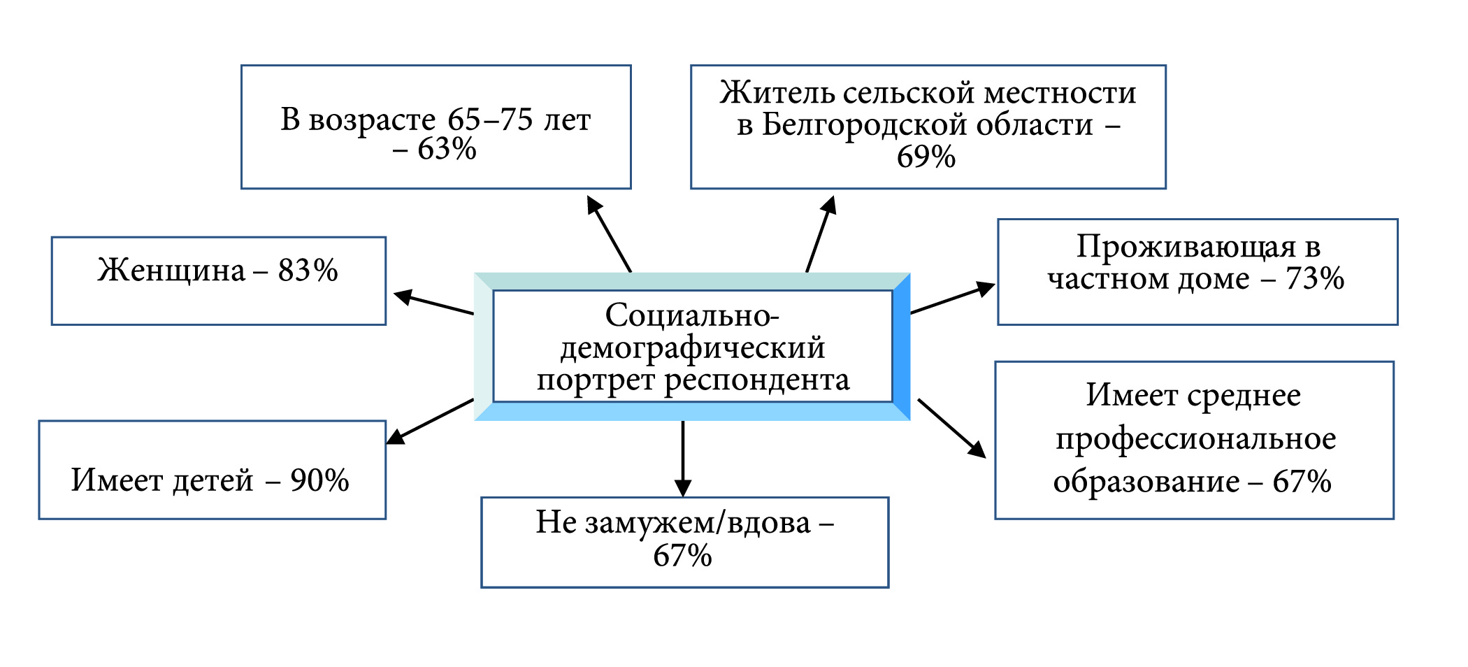 В результате реализации первого этапа социологического исследования сформирован общий социально-демографический портрет респондента, посещающего аптеку в сельской местности. Установлено, что это женщина (83%) в возрасте 65–75 лет (63%), которая проживает в сельской местности (69%), преимущественно в частном доме (73%), имеет среднее профессиональное образование (67%), не замужем / вдова (67%), имеет детей (90%). Данные представлены на рисунке 1.