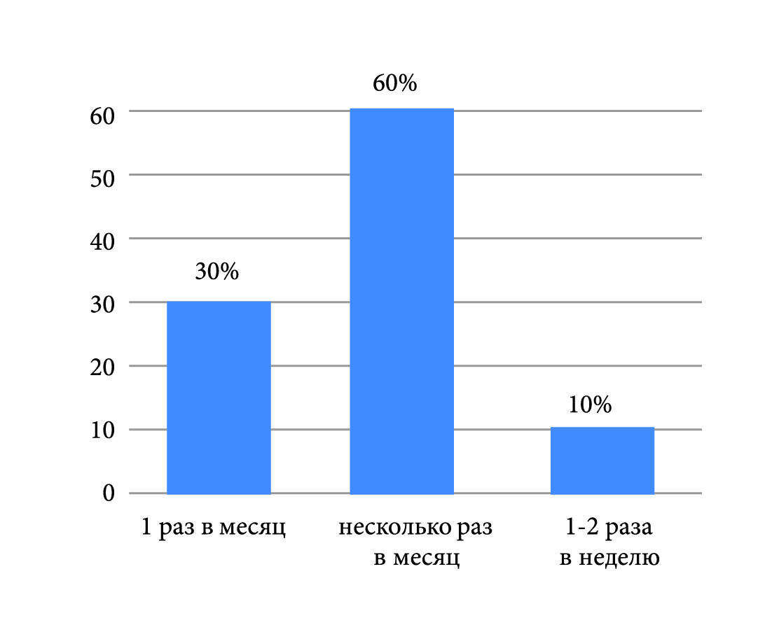 На следующем этапе проведен анализ степени удовлетворенности респондентов фармацевтической помощью. Установлено, что частота посещения аптек пожилыми людьми различается. Так, пожилые жители сельской местности обращаются в аптеку преимущественно несколько раз в месяц – 60%, один раз в месяц обращаются в аптеку 30% опрошенных и лишь 10% респондентов посещают аптеку регулярно – 1–2 раза в неделю (рисунок 2).