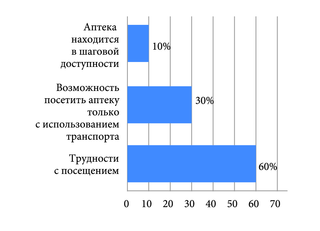 Выявлено, что 60% пожилых людей в сельской местности указывают на трудности с посещением аптечной организации в силу собственной ограниченной мобильности и отсутствия сопровождения, а каждый третий опрошенный пожилой человек имеет возможность посетить аптеку только с использованием транспорта (рисунок 3).