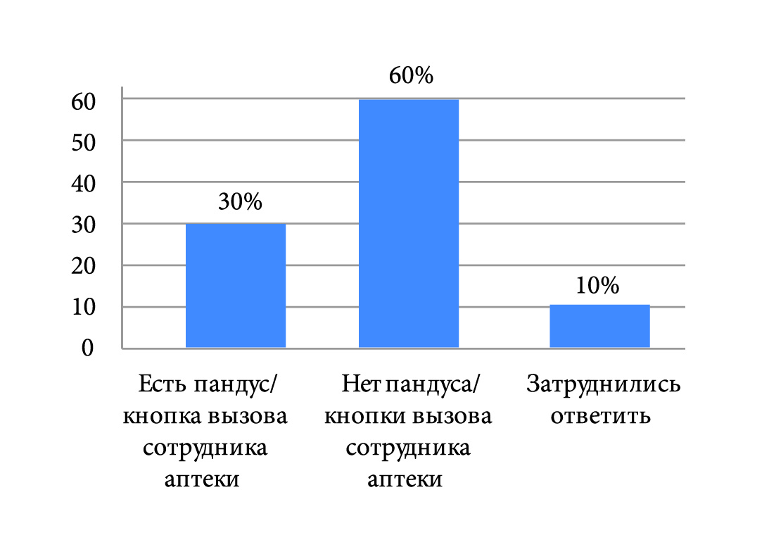 Также 60% опрошенных отметили отсутствие элементов доступной среды (рисунок 4). Данный факт является негативным и отражает низкий уровень доступности фармацевтической помощи для изучаемой категории посетителей.