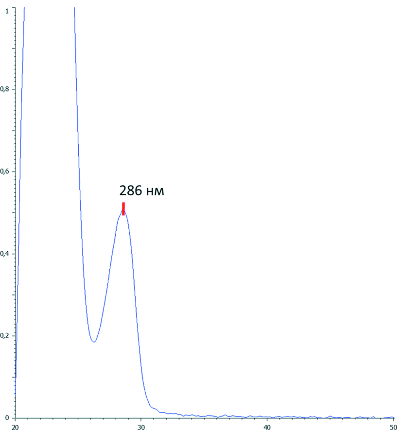 Заготовка растительного сырья изучаемых видов рода Шалфей (Salvia L.) проводилась в период цветения с мая по август 2024 года. Листья шалфея лекарственного (Salvia officinalis L.) заготавливали в Ботаническом саду Самарского университета (г. Самара). Листья шалфея мутовчатого (Salvia verticillata L.) и листья шалфея кустарникового (Salvia dumetorum Andrz. ex Besser) собирали в селе Камышла (Самарская область, Камышлинский район), листья шалфея дубравного (Salvia nemorosa L.) и листья шалфея поникающего (Salvia nutans L.) – в селе Алексеевка (Самарской область, Алексеевский район). Видовая специ-фичность анализируемых объектов подтверждена при помощи определителей растений средней полосы России, а также в сравнении с гербарными образцами достоверных видов рода Шалфей (Salvia L.) из коллекции гербарного фонда Самарского национального исследовательского университета имени академика С.П. Королева (Salvia dumetorum Andrz. ex Besser., Lamiaceae. Голотип: «Российская Федерация, Самарская обл., Кинельский р-н, окр. г. Кинель. Луговая степь, 19.06.2004» (SMR 02717); Salvia nemorosa L., Lamiaceae. Голотип: «Российская Федерация, Самарская обл., Сызранский р-н, окр. с. Троицкого. Многолетняя залежь около Барского парка с. Богородицы, 19.06.1986» (SMR 08433); Salvia verticillata L., Lamiaceae. Голотип: «Российская Федерация, Оренбургская обл., Алексеевский р-н, 2 км СЗ с. Мочегай. Разнотравно-ковыльные степи, 19.07.2007» (SMR 04871); Salvia nutans L. Lamiaceae. Голотип: «Российская Федерация, Оренбургская обл., Шарлыкский р-н, долина р. Нети. Каменистая степь на обнажениях коренных материнских пород верхнепермской системы. 26.05.1983» (SMR 02358)) [5, 6, ]. Для расчета удельного коэффициента поглощения карнозоловой кислоты применяли спектральный анализ в УФ-диапазоне. Для этого около 0,01 г (точная навеска) карнозоловой кислоты помещали в мерную колбу вместимостью 50 мл, растворяли в 30 мл спирта этилового 96% при нагревании на водяной бане. Использование спирта этилового 96% позволило обеспечить наилучшее растворение стандартного образца карнозоловой кислоты. После охлаждения содержимого колбы до комнатной температуры его объем довели спиртом этиловым 96% до метки. Измеряли оптическую плотность полученного раствора на спектрофотометре СФ-2000 при длине волны 286 нм (рисунок 2).