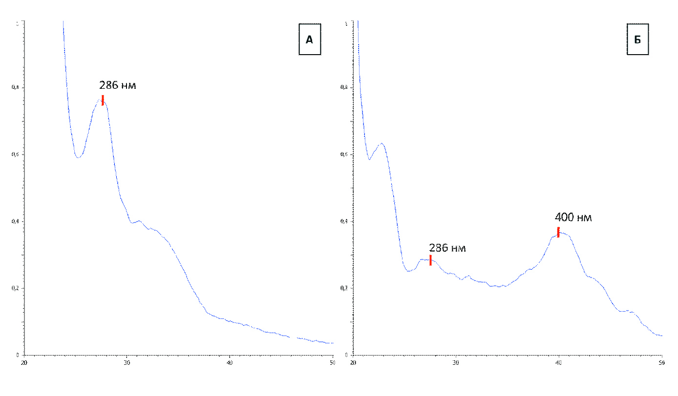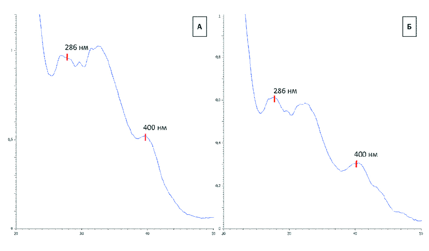 Рисунок 4. Электронный спектр поглощения испытуемых растворов: A – из листьев шалфея поникающего (Salvia nutans L.); Б – из листьев шалфея дубравного (Salvia nemorosa L.).