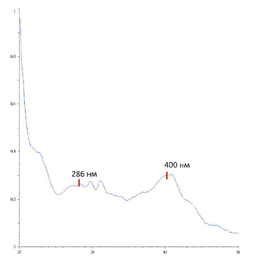 В соответствии с полученными результатами заметно сходство спектральных кривых шалфея мутовчатого (рисунок 3Б) и шалфея кустарникового (рисунок 5). Однако максимум поглощения карнозоловой кислоты при 286 нм выражен слабее. При этом у данных видов в спектральной кривой поглощения преобладает максимум с длиной волны в области 400 нм. Отличие спектральных кривых поглощения может быть использовано при химической таксации видов и подтверждении подлинности фармакопейного сырья шалфея лекарственного.