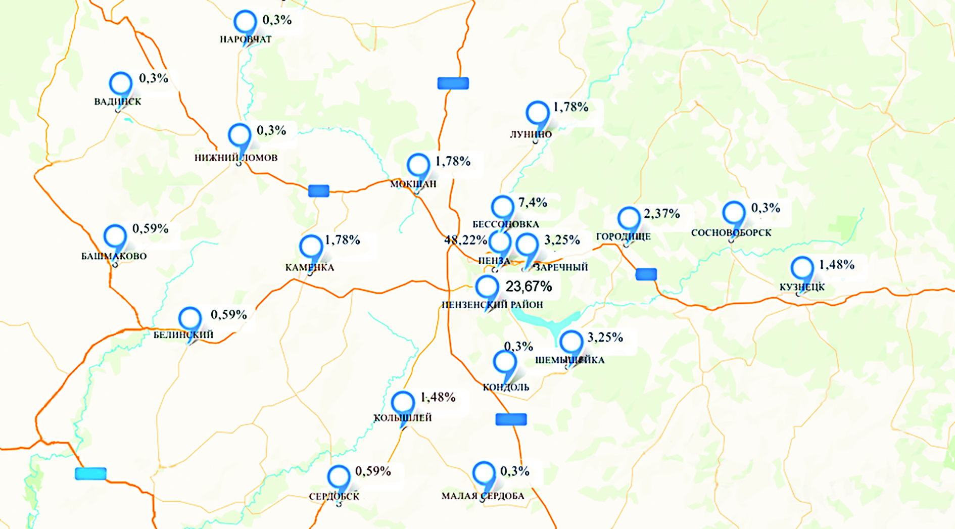 Из 1570 исследованных клещей оказались инфицированными 338 особей (21,53%), из них в городе Пензе и Пензенском районе выявлено 71,89% случаев, в других районах области – 28,11%. Выявлено 20 административных районов, в которых инфицирование составило от 0,3% до 23,67% (рисунок 1). Самое большое число подтвержденных случаев инфицирования зарегистрировано в городе Пензе (48,22%).