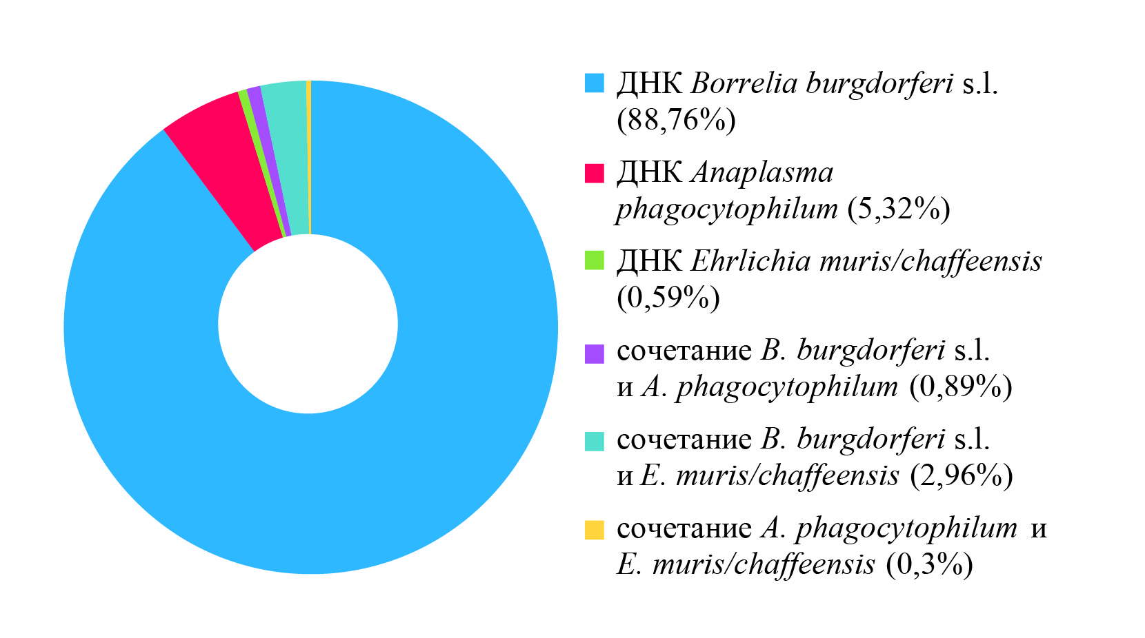 Среди особей рода Ixodes ricinus ДНК Borrelia burgdorferi s.l. выявлена в 300 образцах (88,76%), ДНК Anaplasma phagocytophilum – в 18 (5,32%) и ДНК Ehrlichia muris/chaffeensis идентифицирована в двух образцах (0,59%). Также среди клещей данного рода обнаружены сочетания нескольких возбудителей: B. burgdorferi s.l. и A. phagocytophilum – 3 случая (0,89%), B. burgdorferi s.l. и E. muris/chaffeensis – 10 (2,96%) и A. phagocytophilum и E. muris/chaffeensis – один случай (0,30%) (рисунок 2).