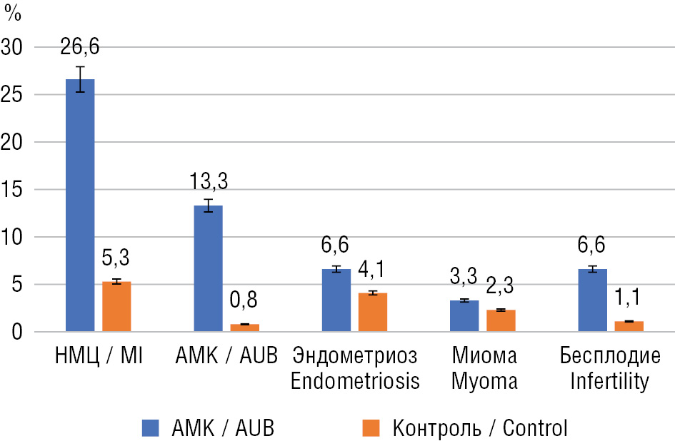 В группе девочек с АМК нарушение менструального цикла у мамы встречалось в 26,5 % случаев, 13,3 % из которых были АМК пубертатного периода (р < 0,05). В группе контроля нарушение менструального цикла у матерей встречалось в 10,1 % случаев и в 6,4 % — в пубертатном периоде (р < 0,05). Эндометриоз был диагностирован в 6,6 % случаев, миома матки — в 3,3 % (р < 0,05); у матерей девочек группы контроля — в 4,1 и 2,3 % (р < 0,05) соответственно. Бесплодие в анамнезе в первой группе составляло 6,6 %, во второй — 1,1 % (р < 0,05) (рис. 1).
