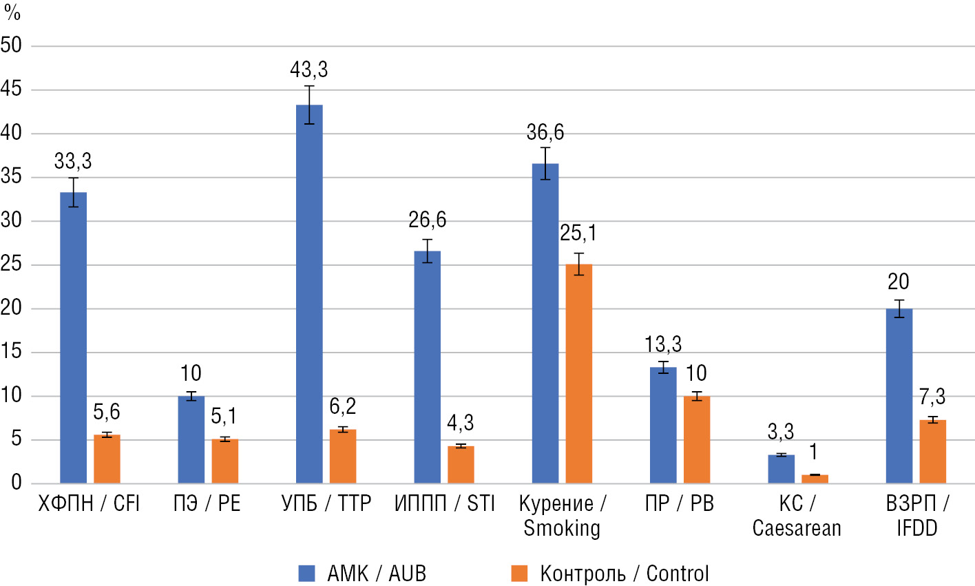 Рис. 2. Антенатальные/интранатальные факторы риска, развития аномальных маточных кровотечений (АМК). ХФПН — хроническая фетоплацентарная недостаточность; ПЭ — преэклампсия; УПБ — угроза прерывания беременности; ИППП — инфекции, передающиеся половым путем; ПР — преждевременные роды; КС — кесарево сечение; ВЗРП — внутриутробная задержка развития плода / Fig. 2. Antenatal/intranatal risk factors for the development of abnormal uterine bleeding (AUB). CFI — chronic fetoplacental insufficiency; PE — preeclampsia; TTP — threat of termination of pregnancy; STI — sexually transmitted infections; PB — preterm birth; IFDD — intrauterine fetal development delay