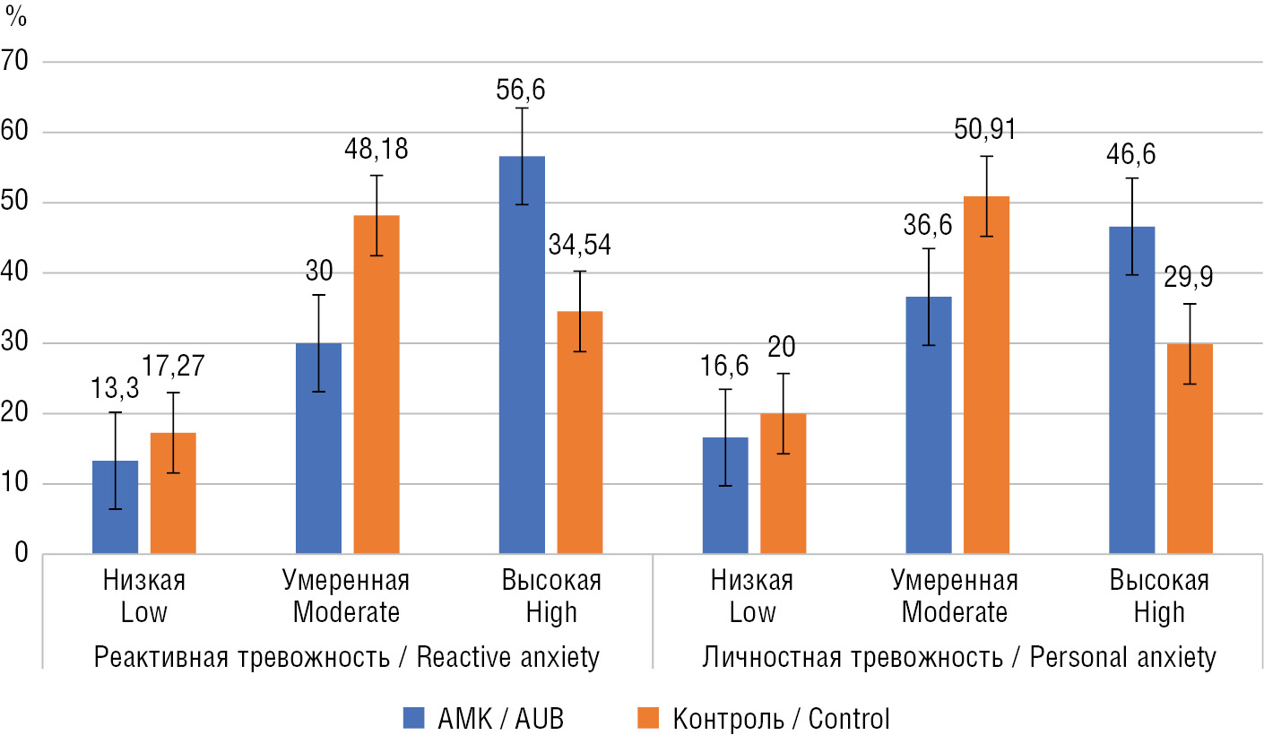 Рис. 4. Уровень реактивной и личностной тревожности у девочек с аномальными маточными кровотечениями (АМК) и у группы контроля / Fig. 4. The level of reactive and personal anxiety in girls with abnormal uterine bleeding (AUB) and in the control group