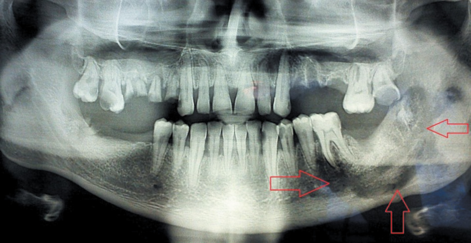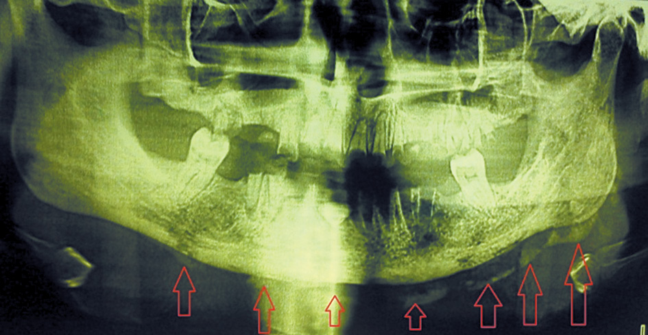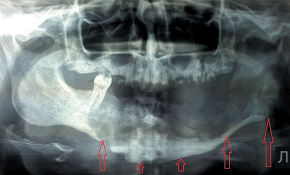 Fig. 5. A newly formed bone along the lower edge of the mandible prevented the displacement of fragments after sequestrectomy / Рис. 5. Новообразованная кость по нижнему краю нижней челюсти предупредила смещение фрагментов после проведения секвестрэктомии