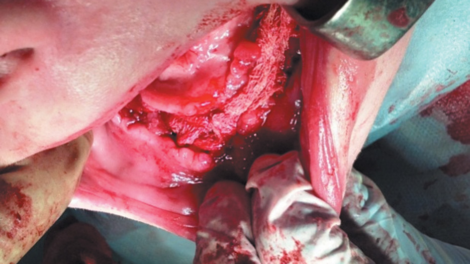 The surgery was performed in 19 patients (including 11 males and 8 females) with lower jaw osteonecrosis. They underwent a sparing sequestrectomy using the method described above. The width of the mandibular defect after sequestrectomy varied from one segment to extensive lesions including the body, angle, and ramus of the mandible. The early postoperative period was characterized by satisfactory healing, without purulent exudation, and wound healing with the formation of pink granulations in the defect area (Fig. 4).