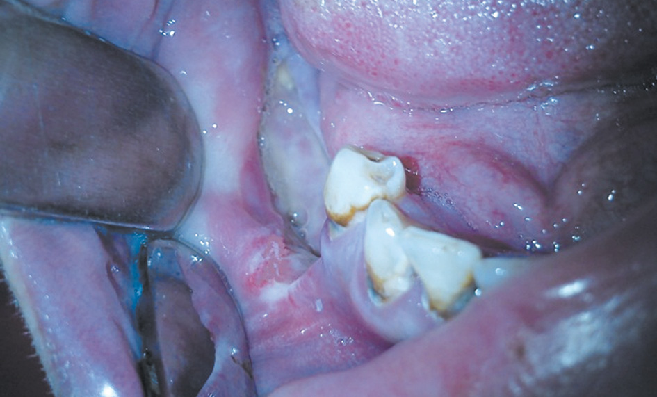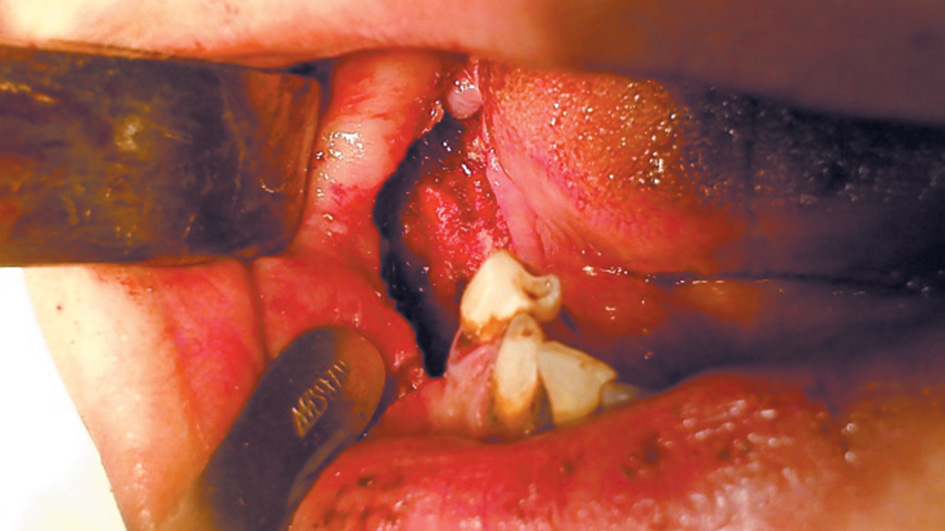 All patients from this group underwent sequestrectomy, which had characteristics that are contrary to the technique used in the treatment of odontogenic osteomyelitis. Indications for local anesthesia have been expanded due to the severe comorbidities in most patients that increase the risk of anesthetic support (chronic viral hepatitis, HIV infection in the acquired immunodeficiency syndrome stage, and chronic inflammatory lung diseases). Additional oral cavity incisions, cutting out the mucoperiosteal flaps, suturing the postoperative defects, and other manipulations that lead to oral mucosa trauma were minimized to prevent the further spread of the necrotic process. The surgical intervention involved the isolation and removal of the sequestrum, as well as the curettage of the surrounding granulation tissue. However, unlike the typical sequestrectomy technique, the mechanical treatment of the sequestral cavity walls due to bleeding and intact bone was not performed since this stage could cause a relapse and further spread of the necrotic process. The postoperative defect was plugged with iodoform turunda until healing signs of the defect by secondary intention occurred (Fig. 3).