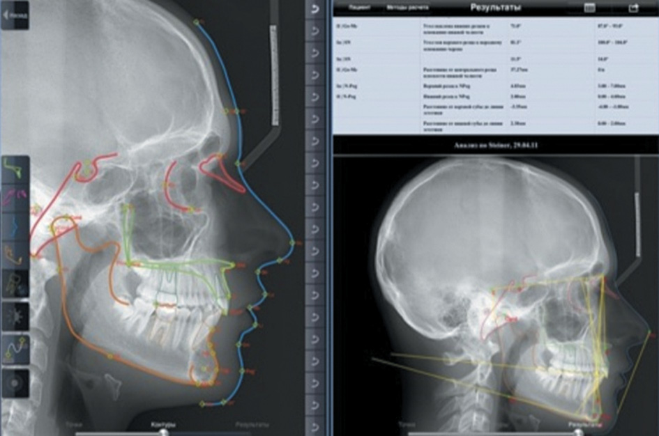 Нами обследованы 22 пациента в возрасте 18–25 лет с гнатической формой дистальной окклюзии зубных рядов. Обследование включало: клинический осмотр, фотометрию лица (рис. 1), анализ телерентгенограмм головы в боковой проекции (рис. 2) и антропометрию гипсовых моделей зубных рядов (рис. 3), миотонометрию жевательных мышц (рис. 4).
