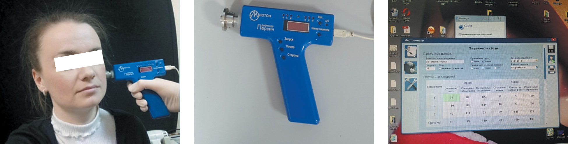 Проведен анализ функционального состояния тонуса мышц челюстно-лицевой области. Измерение тонуса мышц проведено аппаратом Миотон-3с (рис. 4). Измерение тонуса жевательных мышц у обследуемой группы пациентов с дистальной аномалией окклюзии проведено в трех состояниях: в состоянии физиологического покоя, первичного смыкания и максимального сжатия.