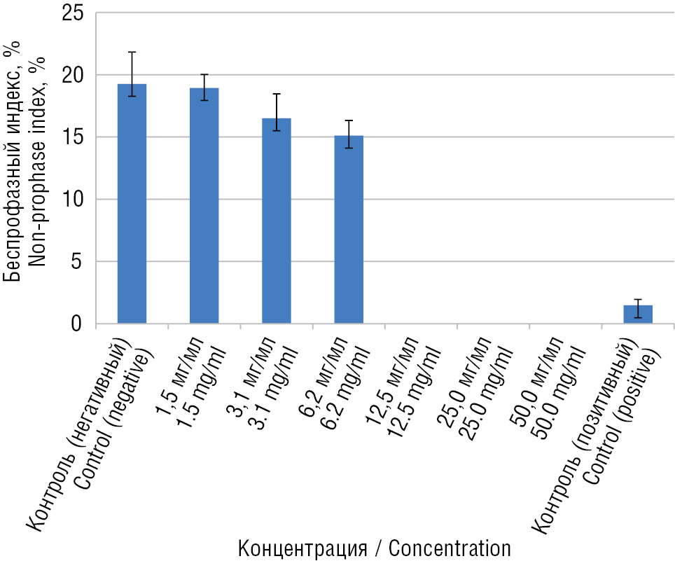 Для оценки митозмодифицирующего действия рассчитывали показатели митотического индекса без учета клеток на стадии профазы (беспрофазного индекса), так как при рутинном способе окраски визуально трудно различить стадии интерфазы и ранней профазы [8]. Беспрофазный индекс вычисляли по формуле: