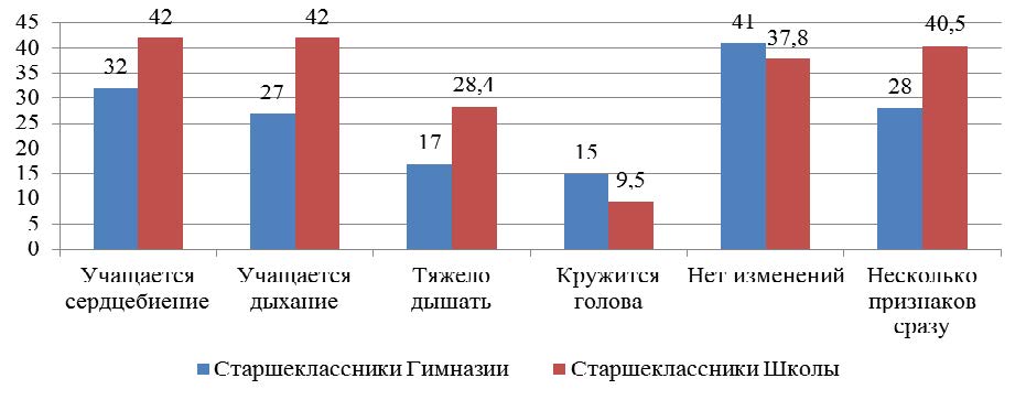 Интерес представляет полученная информация о спортивных предпочтениях старшеклассников (рис. 1). 41,9 % гимназистов и 75,1 % школьников ответили, что занимаются спортом дополнительно (хи-квадрат – 14,212, уровень асимптоматической значимости 0,001). Однако отличаются предпочтения в выборе видов спорта. Самой популярной спортивной секцией среди юношей школы является спортивные единоборства и боевые искусства (бокс, карате, дзюдо, самбо, борьба, тхэквондо), в которых занимаются 51,8 % респондентов (гимназистов лишь 4,1 %; р ≤ 0,001). Гимназисты предпочитают подвижные командные игры (футбол, баскетбол, гандбол, волейбол, плавание), для которых характерна некоторая корпоративность. Девушки независимо от вида образовательной организации больше предпочитают занятия по легкой атлетике (13,6–24,4 %), танцы (7,9–20,9 %) или плавание (9,8–6,7 %). Для определения соответствия физических нагрузок состоянию здоровья и уровню подготовленности опрошенных подростков использовали наличие внешних признаков утомления при занятиях спортом.