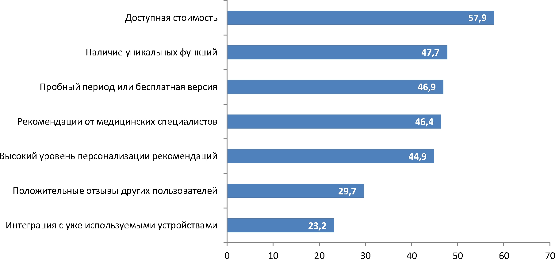 Приоритеты ответов респондентов на вопрос о наиболее полезных функциях цифрового помощника для здоровья представлены на рис. 1. В возрастных группах до 35 лет оплачивать подписку на цифрового помощника здоровья готово более 70 % респондентов, рейтинг факторов, имеющих значение при принятии решения, представлен на рис. 2. Необходимо отметить, что повышают приверженность к применению мобильного приложения такие факторы, как удобный и технически стабильный дизайн, настраиваемые push-уведомления, персонализированный контент, пассивное отслеживание данных, интегрированные в приложение руководство по использованию и поддержка пользователя, геймификация и социальные функции [9].