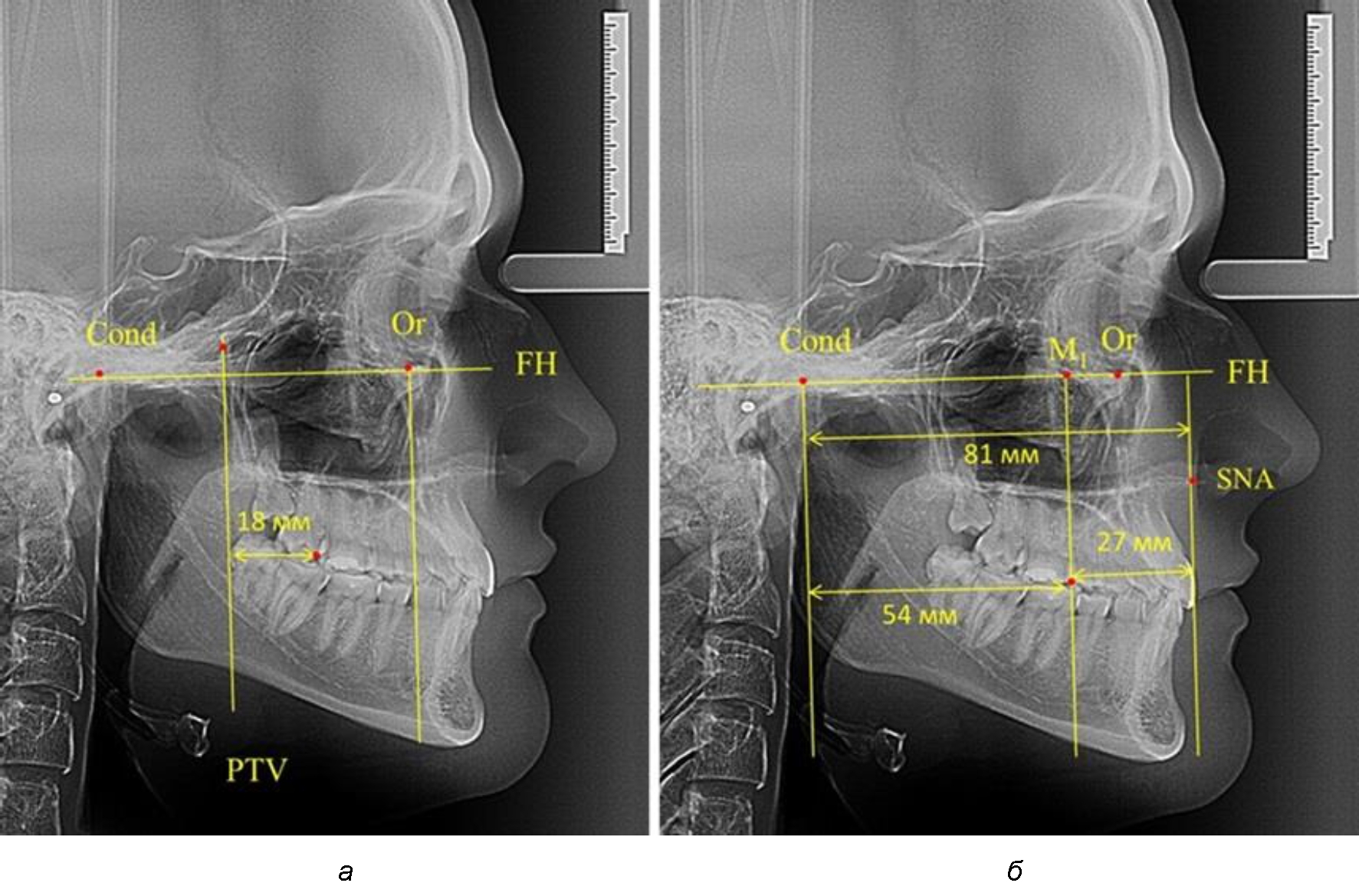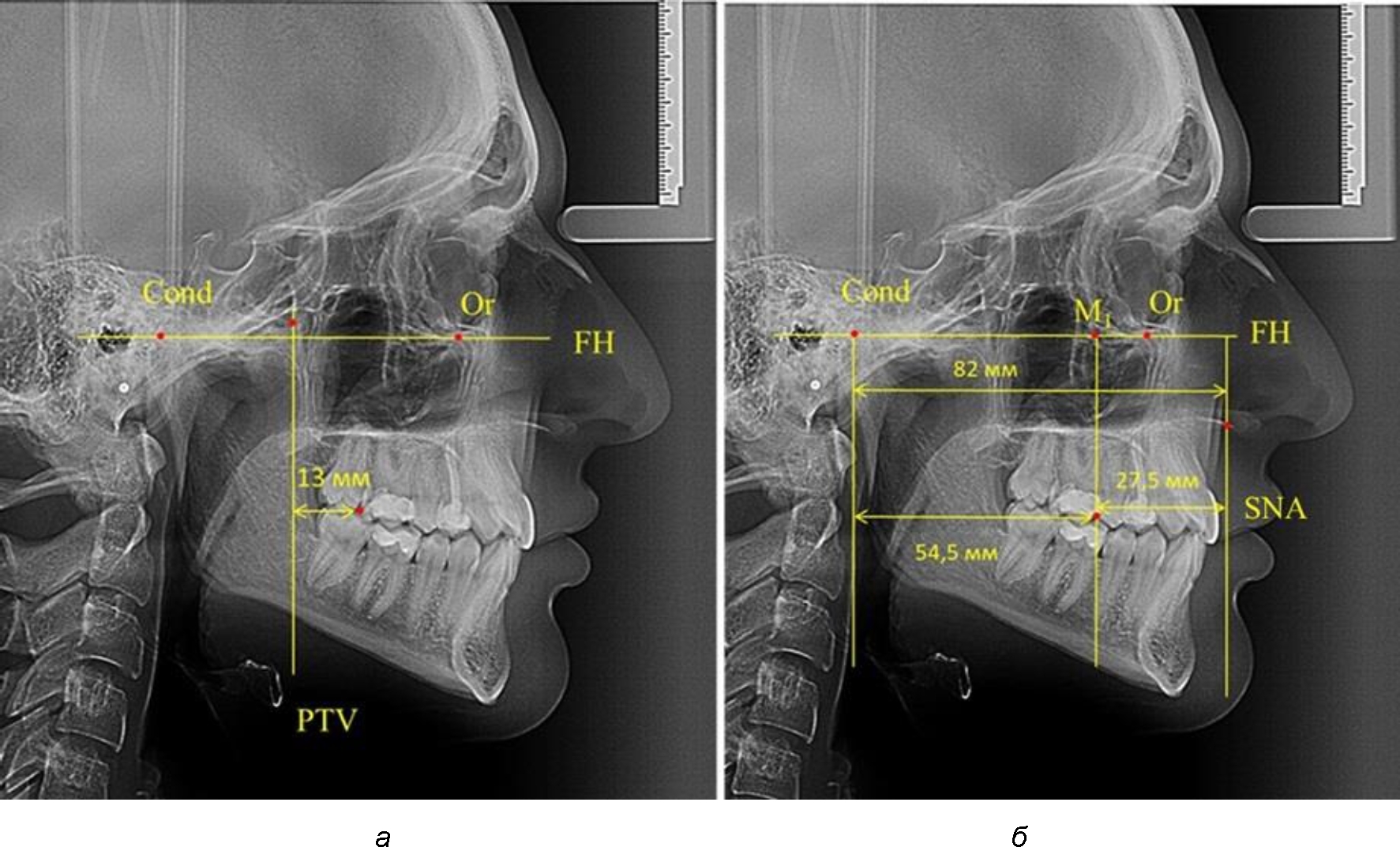 Так, при расстоянии от крыловидной вертикальной плоскости PTV до дистальной поверхности верхнего первого постоянного моляра в 13 мм сагиттальный размер гнатического отдела был 82 мм. При этом отношение кондилярно-спинального расстояния к кондилярно-молярному размеру (54,5) было близким к коэффициенту 1,5, что представлено на рис. 2.