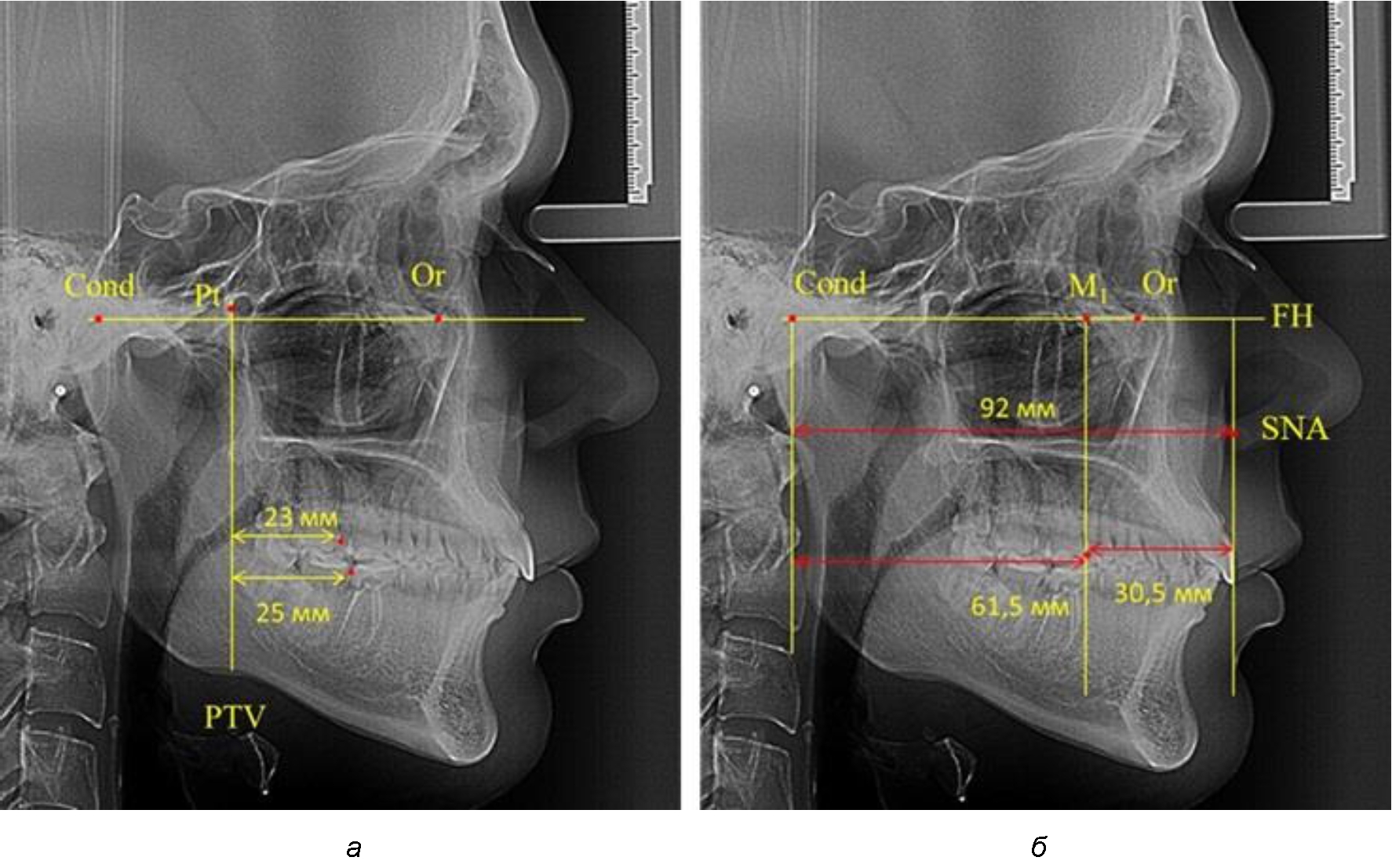 Анализ проведенного исследования рентгенограмм показал существенную вариабельность практически всех линейных показателей. У молодых людей с физиологическим прикусом постоянных зубов расстояние от крыловидной вертикальной плоскости PTV до дистальной поверхности верхнего первого постоянного моляра в целом по группе составляло (18,37 ± 3,62) мм. Обращает на себя внимание большая ошибка репрезентативности из-за разницы между максимальными и минимальными значениями.