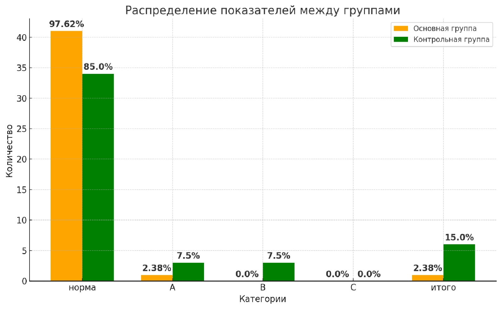 Статистически значимых различий между группами по возрасту, полу, массе тела и ИМТ выявлено не было (p > 0,05), что обеспечило сопоставимость групп для дальнейшего анализа.