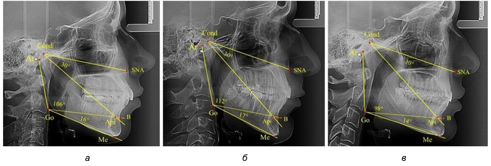 Рис. 3. Особенности ТРГ при нейтральном (а), вертикальном (б) и горизонтальном (в) типе угла нижней челюсти в постоянном прикусе