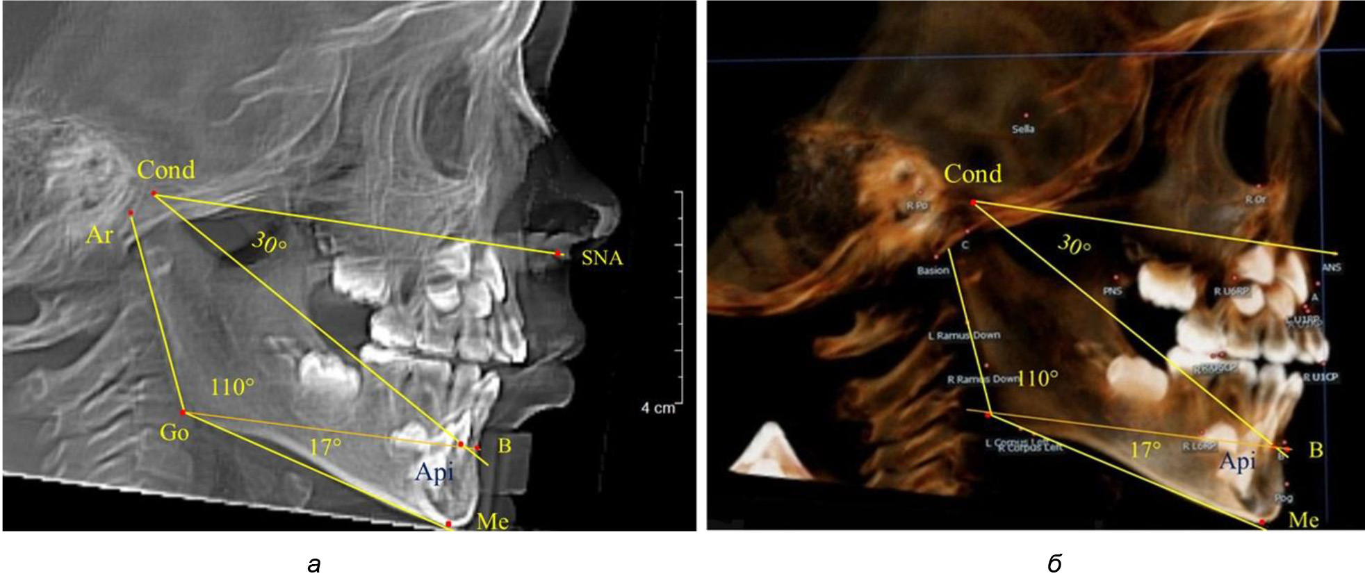 Через апикальную точку нижнего резца от суставной точки проводили линию Cond-Api, которая с линией Cond-SNA образовывала угол гнатический части лица SNA-Cond-Api, используемый для оценки ее основных параметров.